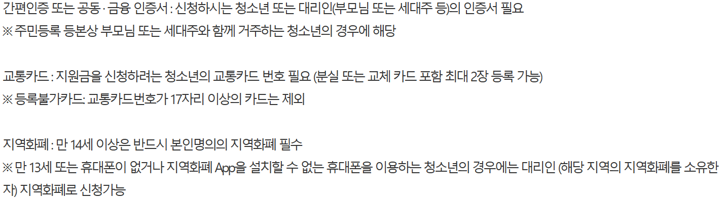 - 청소년 본인 명의의 지역화폐로 지원금 지급 (단, 만 13세 또는 휴대폰이 없거나 지역화폐 App을 설치할 수 없는 휴대폰을 이용하는 청소년은 대리인의 지역화폐로 지급)