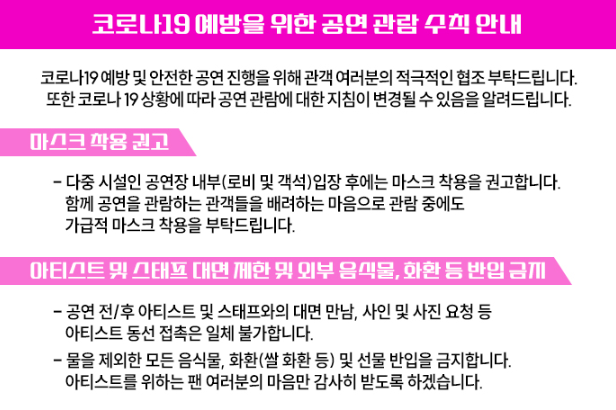 또한 공연 전/후 아티스트 및 스태프와의 대면 만남, 사인 및 사진 요청 등 아티스트 동선 접촉이 일체 불가하다고 하니 이 점 참고하시기 바랍니다.