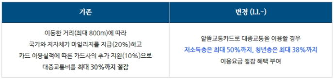 1월 1일부터 저소득층(차상위계층, 기초생활수급자) 및 청년층(만 19세~34세)의 교통비 부담 경감을 위해 기존 알뜰교통카드의 혜택이 대폭 강화되었다고 합니다.