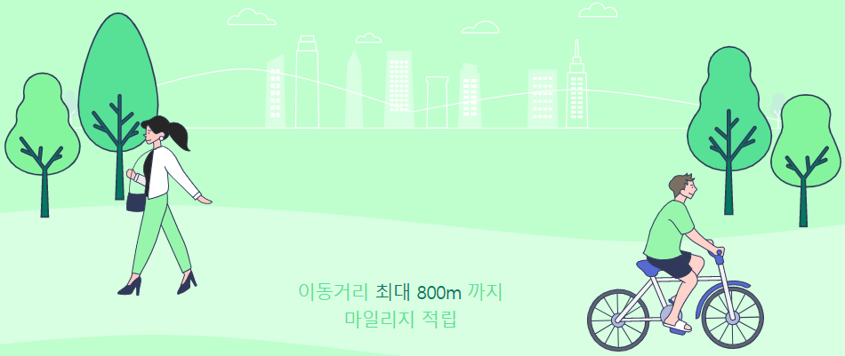 지하철 또는 버스정류장까지 보행 혹은 자전거로 이동 시 최대 800미터 내 이동거리에 비례하여 마일리지를 지급합니다.