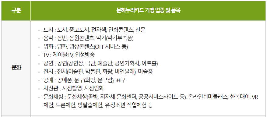 문화의 경우는 또다시 도서, 영화, 음악, OTT, 전시, 공연으로 나뉘는데요. 각 분류마다 사용처는 다양하지만 대표적인 몇 가지를 알려 드리겠습니다.