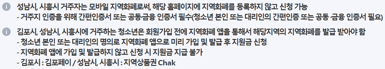 - 청소년 본인 명의의 지역화폐로 지원금 지급 (단, 만 13세 또는 휴대폰이 없거나 지역화폐 App을 설치할 수 없는 휴대폰을 이용하는 청소년은 대리인의 지역화폐로 지급)